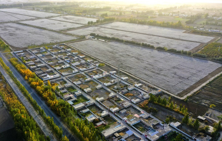 This aerial photo taken on Oct. 18, 2022 shows cotton fields in Hongqi Township of Xayar County, northwest China's Xinjiang Uygur Autonomous Region. (Photo by Liu Yuzhu/Xinhua)