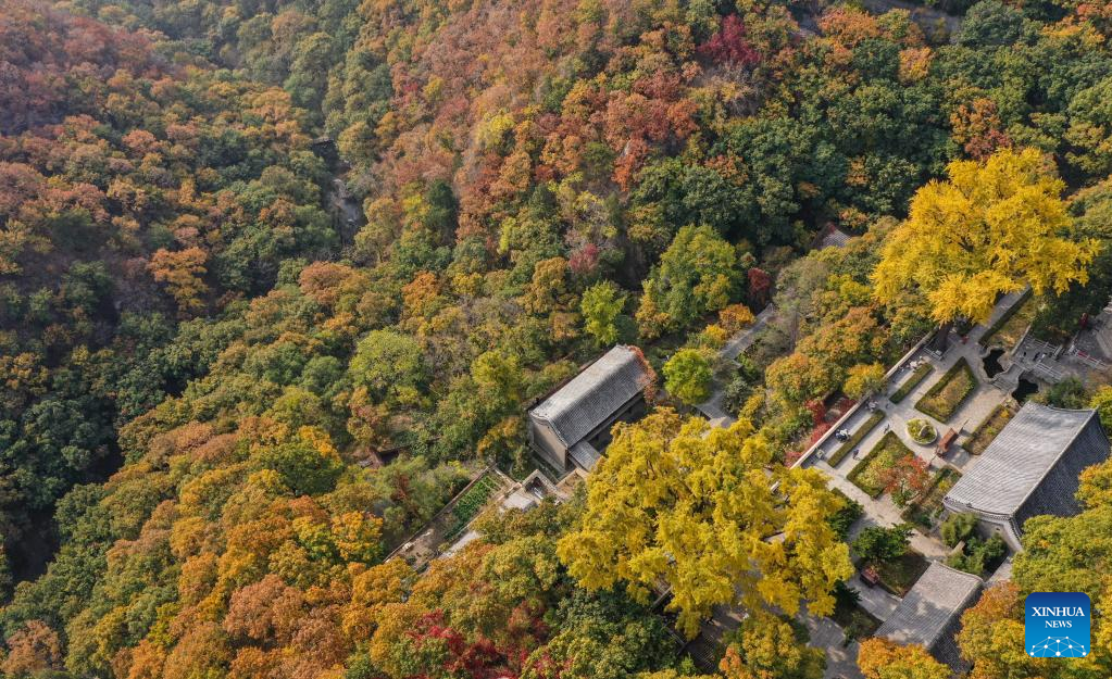 This aerial photo taken on Oct. 25, 2022 shows the scenery of Panshan Mountain scenic resort in Jizhou District, north China's Tianjin. (Xinhua/Sun Fanyue)