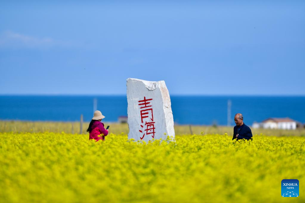 This photo taken on Sept. 14, 2019 shows tourists strolling in cole flower fields along the Qinghai Lake in northwest China's Qinghai Province.