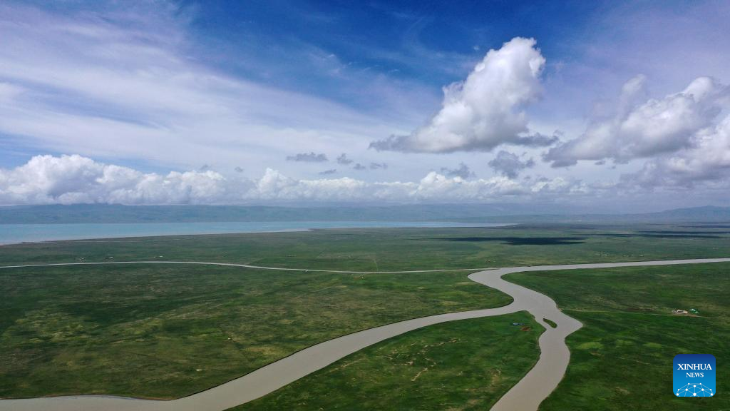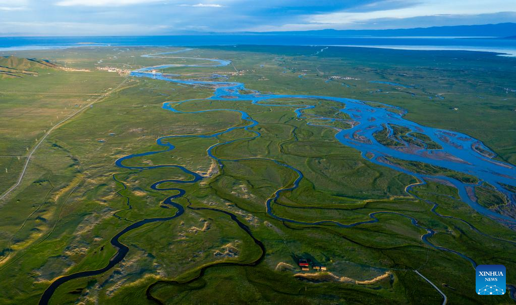 This aerial photo taken on July 10, 2020 shows a view of Buh River wetland at Qinghai Lake in northwest China's Qinghai Province.