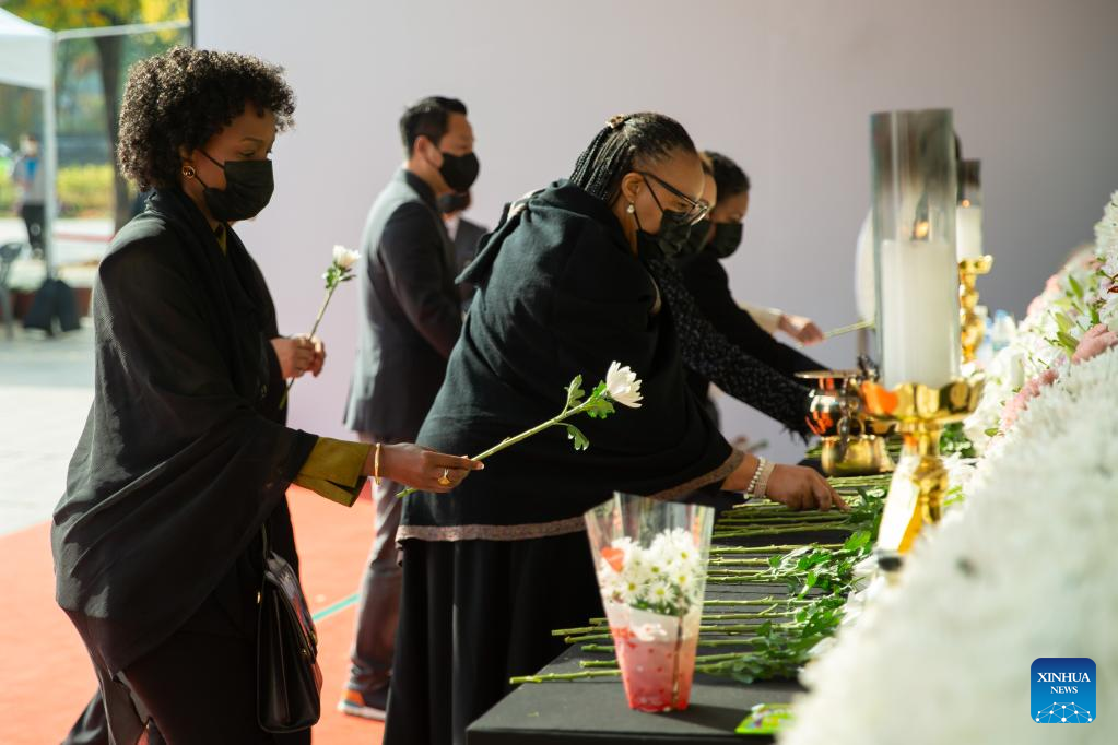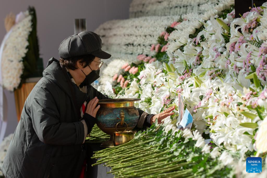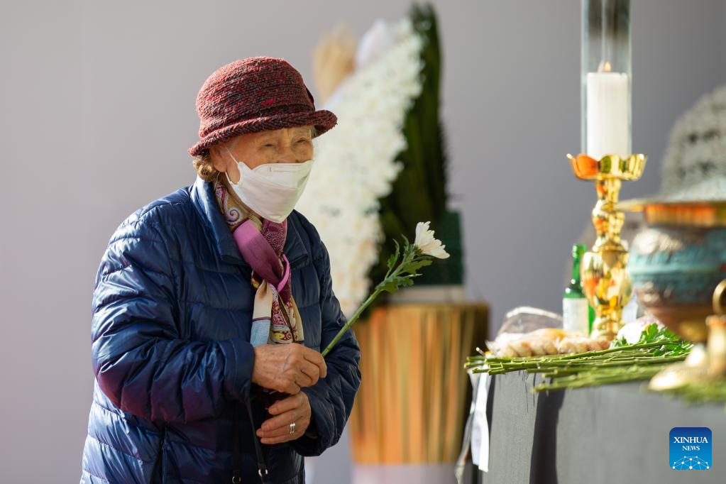 People lay flowers to a mourning altar set up at Seoul Plaza in Seoul, South Korea, Nov. 1, 2022. The death toll from a crowd crush, which occurred Saturday night at the Itaewon district of the South Korean capital Seoul during Halloween gatherings, rose overnight, the authorities said Tuesday. At least 156 people were killed and 151 others injured in the incident, according to the Ministry of the Interior and Safety. The government has announced a one-week national mourning period over the tragedy until Nov. 5. (Xinhua/Wang Yiliang)