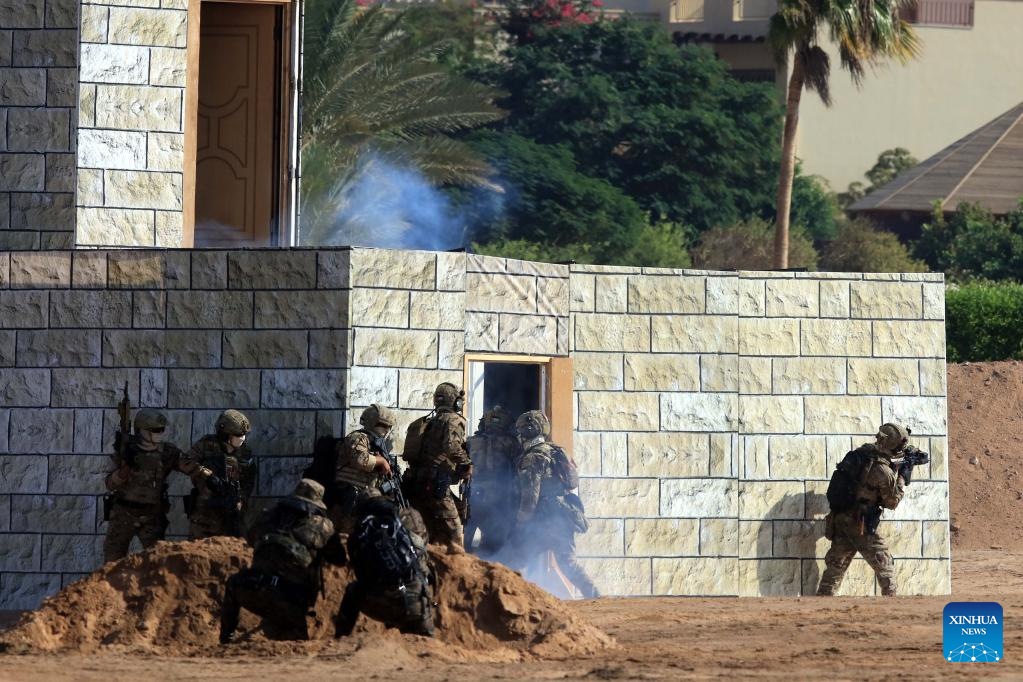 Jordanian special forces take part in a drill at the opening ceremony of the 13th Special Operations Forces Exhibition and Conference (SOFEX) in Aqaba, Jordan, on Nov. 1, 2022. The 13th Special Operations Forces Exhibition and Conference (SOFEX) kicked off in Jordan's Aqaba on Tuesday with the participation of more than 300 companies from 38 countries. (Photo by Mohammad Abu Ghosh/Xinhua)