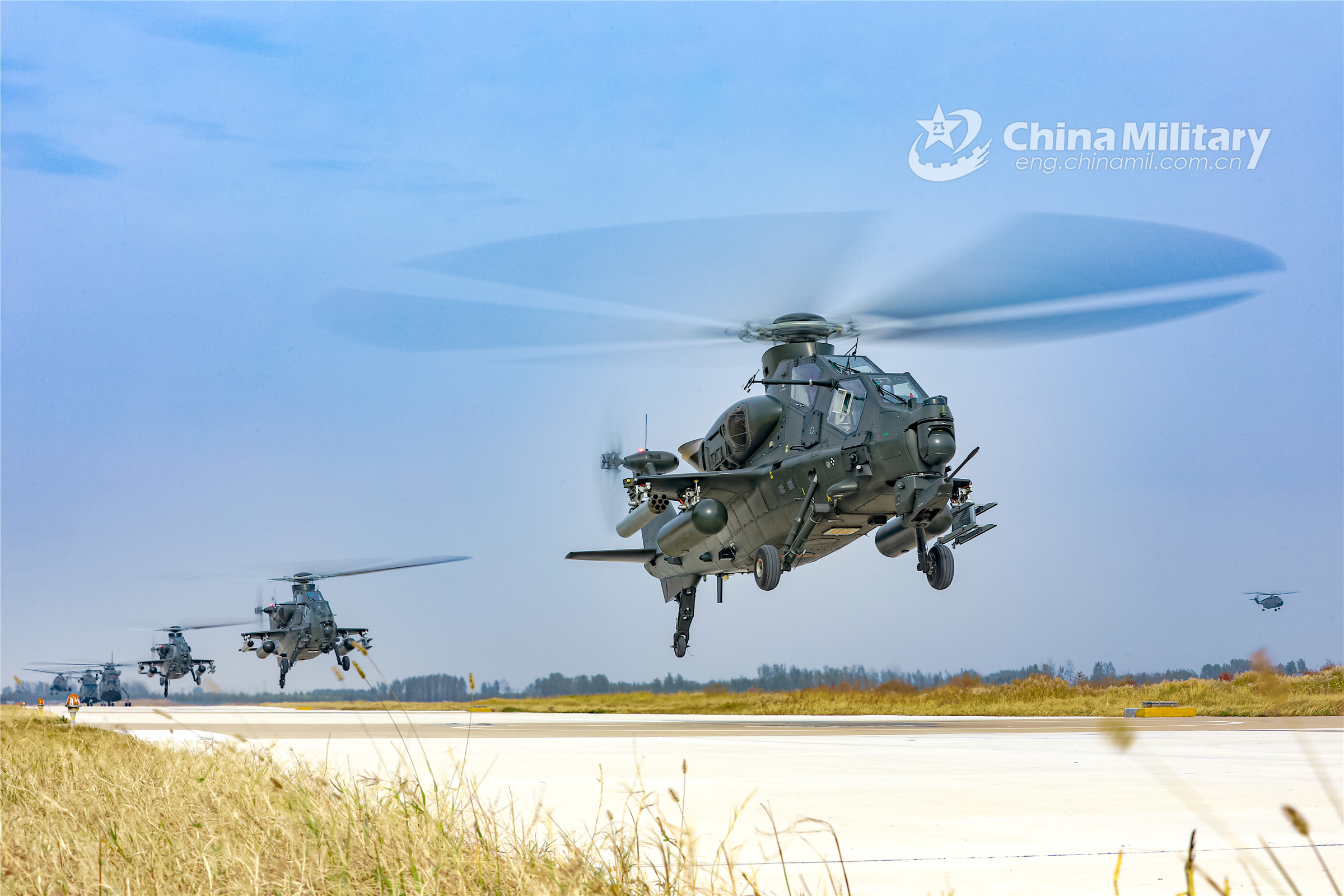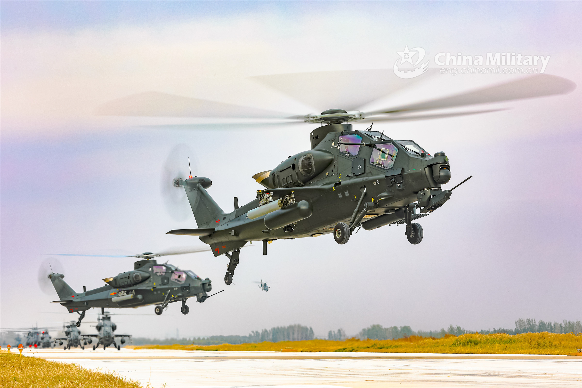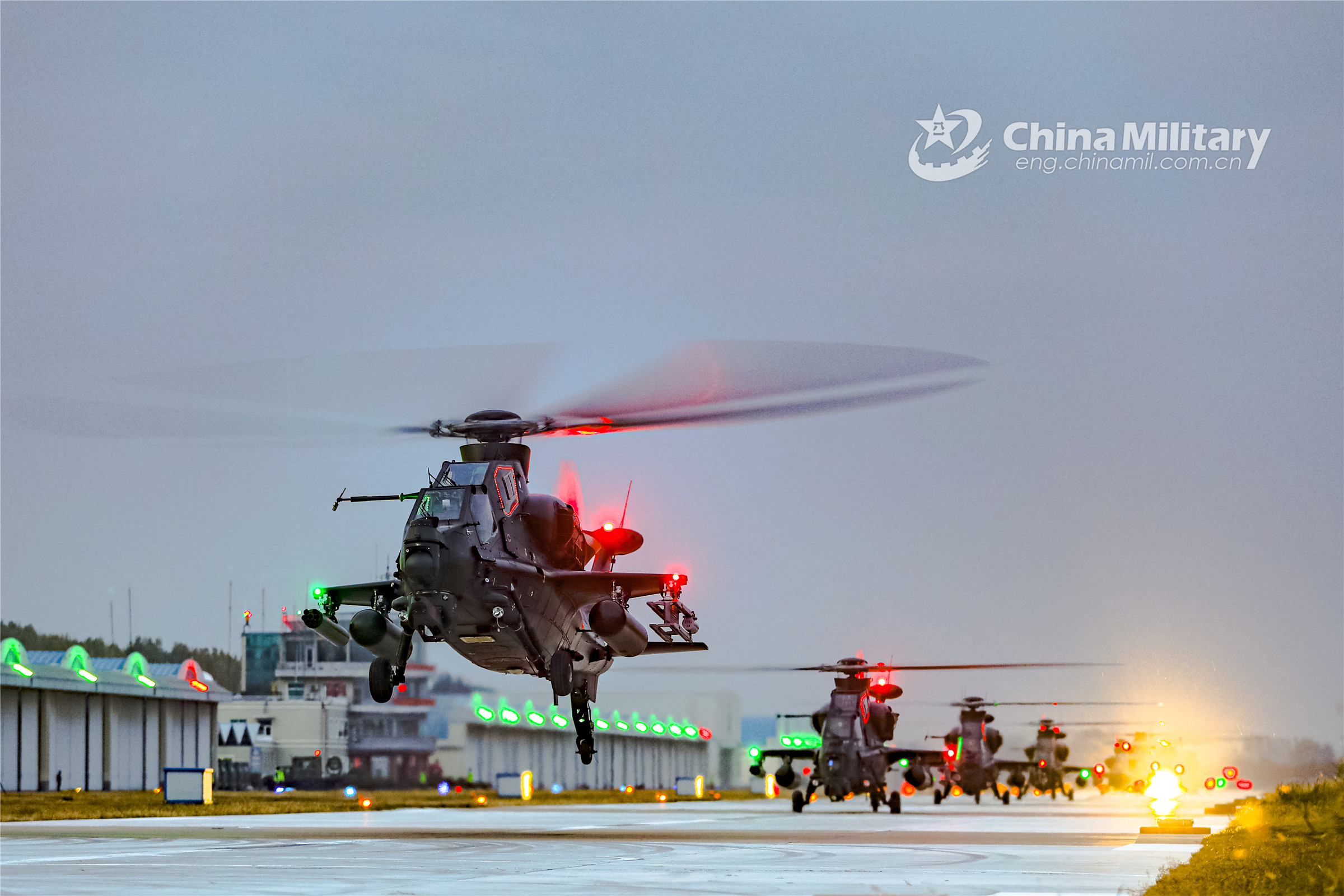Attack helicopters attached to an army aviation brigade under the PLA 80th Group Army take off from the runway successively during a round-the-clock flight training exercise on October 25, 2022. (eng.chinamil.com.cn/Photo by Li Peng)