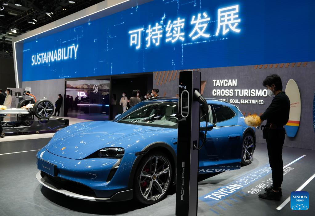 This photo taken on Nov. 6, 2022 shows a new energy vehicle of Porsche at the automobile exhibition area of the fifth China International Import Expo (CIIE) at the National Exhibition and Convention Center (Shanghai) in east China's Shanghai.