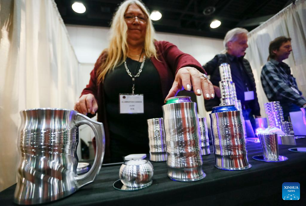 A vendor showcases aluminum-made cups at the Circle Craft Christmas Market in Vancouver, British Columbia, Canada, on Nov. 9, 2022. (Photo by Liang Sen/Xinhua)