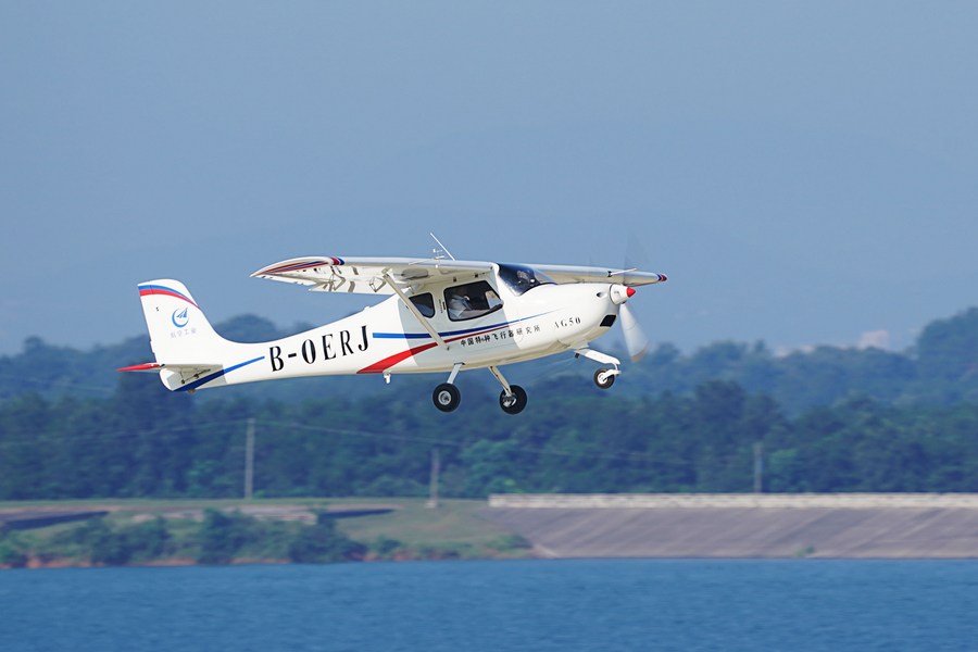 A Lingyan AG50 light-sport aircraft is seen during its maiden flight in Jingmen, central China's Hubei Province, Aug. 26, 2020.(Xinhua)