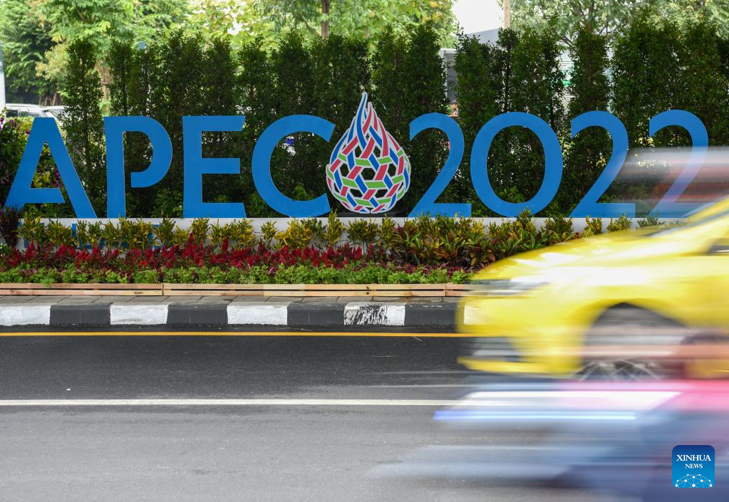 A logo of APEC 2022 is pictured on a street in Bangkok, Thailand, Nov. 16, 2022. The 29th Asia-Pacific Economic Cooperation (APEC) Economic Leaders' Meeting will be held in Bangkok, Thailand, on Nov. 18-19. (Xinhua/Wang Teng)