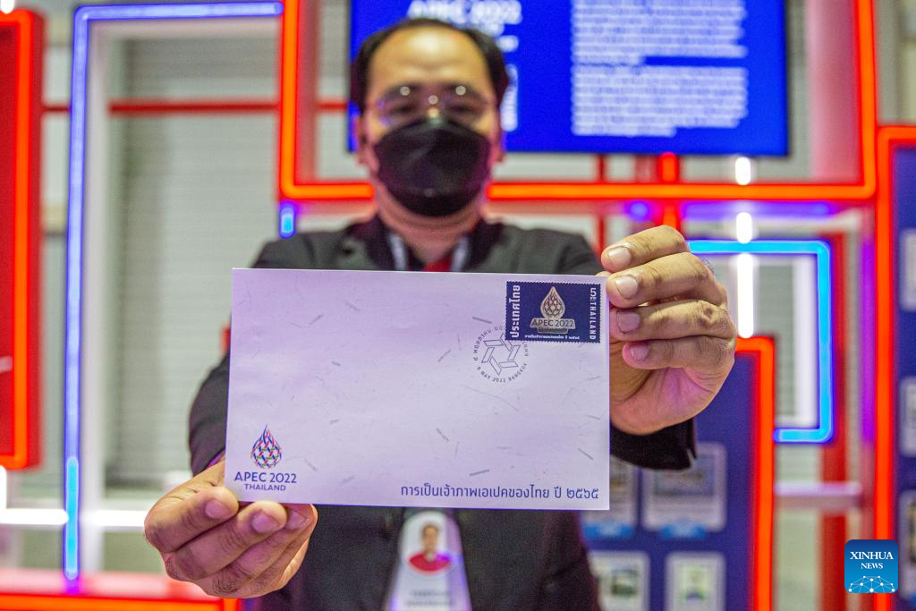 A staff member displays the commemorative envelope and stamp for the APEC 2022 at the media center of the event in Bangkok, Thailand, Nov. 16, 2022. The 29th Asia-Pacific Economic Cooperation (APEC) Economic Leaders' Meeting will be held in Bangkok, Thailand, on Nov. 18-19. (Xinhua/Wang Teng)