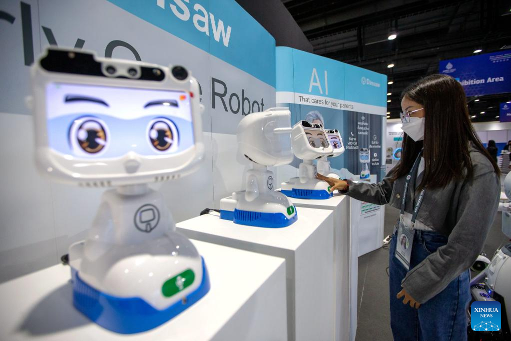 A staff member interacts with a robot at the media center of APEC 2022 in Bangkok, Thailand, Nov. 14, 2022. The 29th Asia-Pacific Economic Cooperation (APEC) Economic Leaders' Meeting will be held in Bangkok, Thailand, on Nov. 18-19. (Xinhua/Wang Teng)