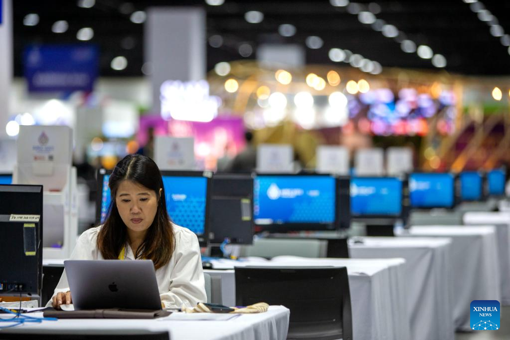A staff member works at the media center of APEC 2022 in Bangkok, Thailand, Nov. 14, 2022. The 29th Asia-Pacific Economic Cooperation (APEC) Economic Leaders' Meeting will be held in Bangkok, Thailand, on Nov. 18-19. (Xinhua/Wang Teng)