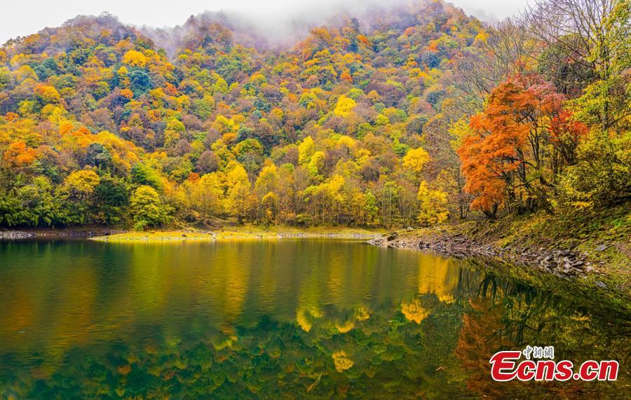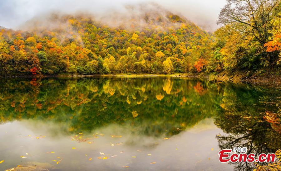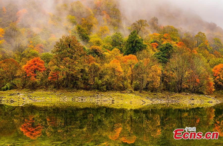 Landscape of the Moon Lake and colorful mountains enveloped in the mist on a winter morning, creating a mysterious scenery in Ya'an City, southwest China's Sichuan Province.(Photo/China News Service)