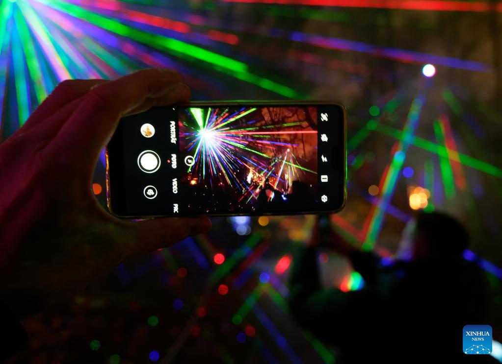 A visitor takes photos of light decorations during the "Christmas Garden Berlin" light show at the Botanical Garden in Berlin, Germany, Nov. 16, 2022. (Photo by Stefan Zeitz/Xinhua)