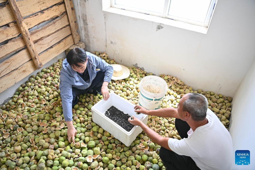 Veterans process xanthoceras fruits at a storage in Qiemo, a desert county in northwest China's Xinjiang Uygur Autonomous Region, July 4, 2022. (Xinhua/Li Xiang)
