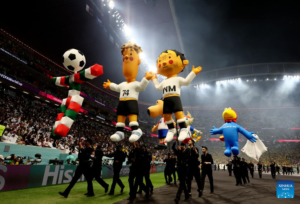 Mascots of previous World Cups are seen during the opening ceremony before the Group A match between Qatar and Ecuador at the 2022 FIFA World Cup at Al Bayt Stadium in Al Khor, Qatar, on Nov. 20, 2022. (Xinhua/Lan Hongguang)