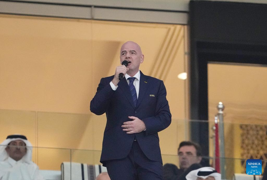 FIFA President Gianni Infantino delivers a speech after the opening ceremony before the Group A match between Qatar and Ecuador at the 2022 FIFA World Cup at Al Bayt Stadium in Al Khor, Qatar, on Nov. 20, 2022. (Xinhua/Zheng Huansong)