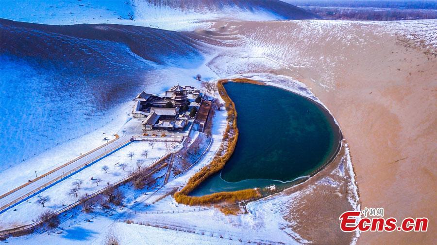 Snow scenery of Mingsha Mountain and Crescent Spring scenic spot in Dunhuang City, northwest China's Gansu Province, Nov. 27, 2022. Dunhuang embraced its first snow of this winter on Sunday. (Photo: China News Servie/Wang Binyin)