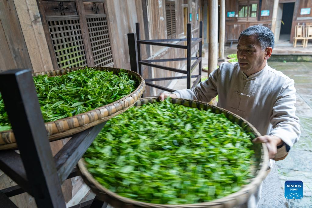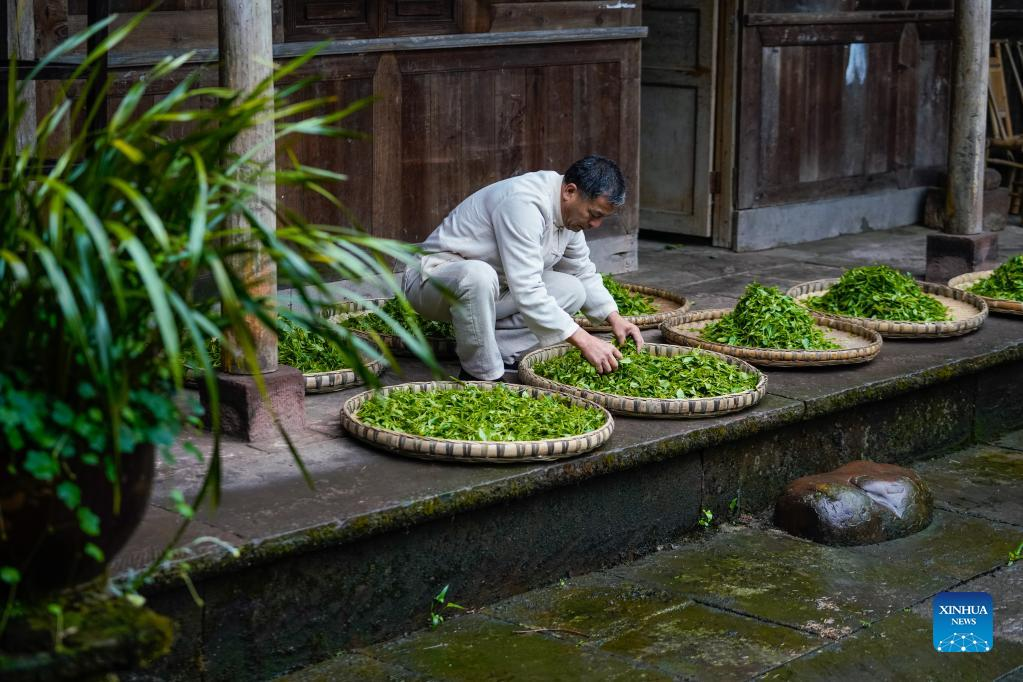 Zhang Yuehua dries newly-picked tea leaves at his ancestral house in Mingshan District of Ya'an City, southwest China's Sichuan Province, March 31, 2022. Zhang, born in 1959, is a representative inheritor of green tea making technique. Boasting a long history of tea cultivation, Ya'an is the birthplace of dark tea and green tea making techniques. Inherited by generations of tea makers, both techniques are now listed as national-level intangible cultural heritage. (Xinhua/Shen Bohan)