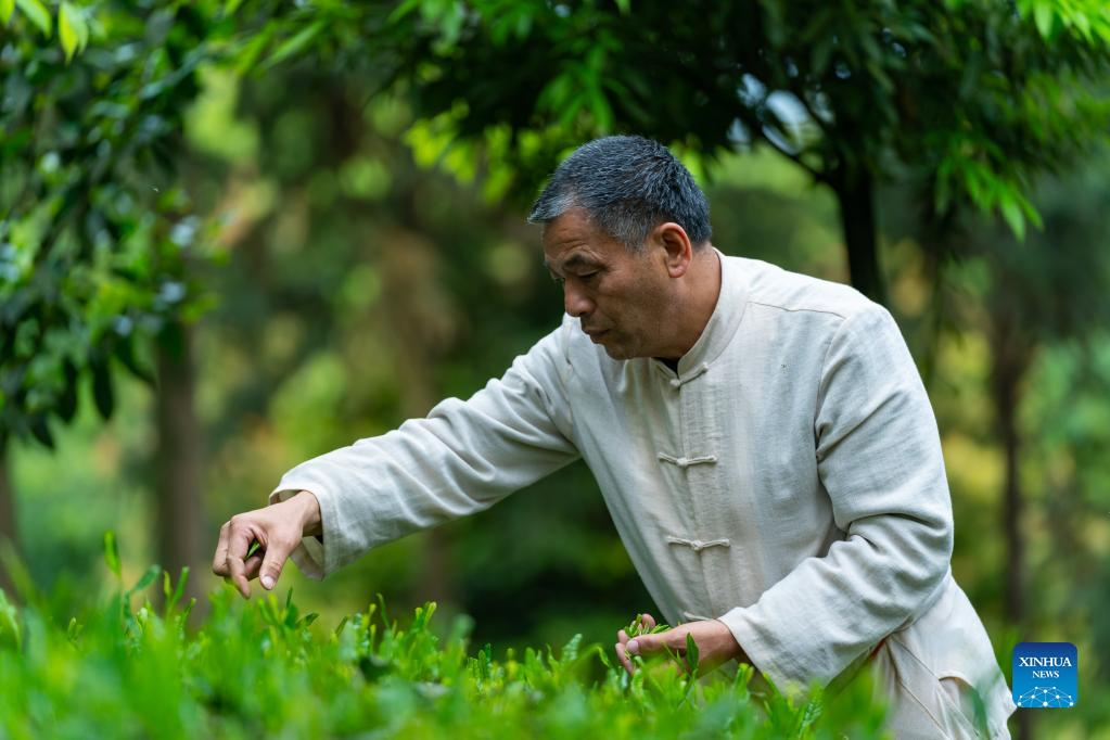 Zhang Yuehua picks fresh tea leaves near his ancestral house in Mingshan District of Ya'an City, southwest China's Sichuan Province, March 31, 2022. Zhang, born in 1959, is a representative inheritor of green tea making technique. Boasting a long history of tea cultivation, Ya'an is the birthplace of dark tea and green tea making techniques. Inherited by generations of tea makers, both techniques are now listed as national-level intangible cultural heritage. (Xinhua/Shen Bohan)