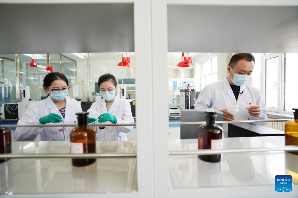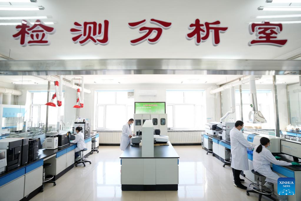 Staff members analyze soil samples at the agricultural technology promotion center of the Qixing Farm Co,. Ltd. under the Beidahuang Group in northeast China's Heilongjiang Province, May 18, 2022. (Xinhua/Wang Jianwei)