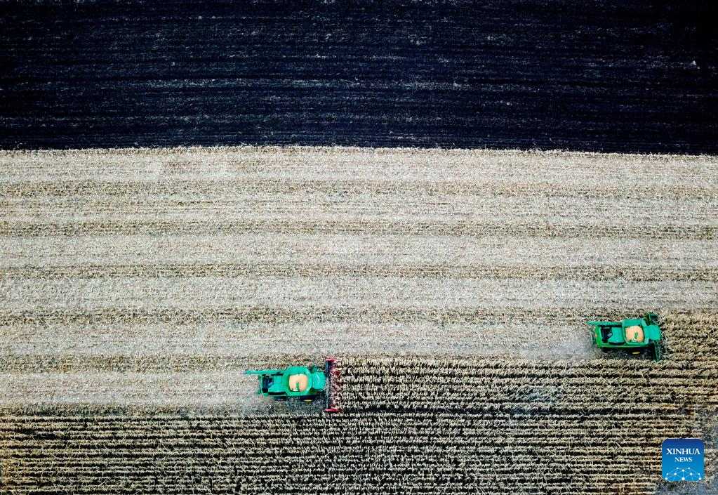 This aerial photo taken on Oct. 15, 2022 shows agricultural machines harvesting corns at Guofu Town, Baiquan County, northeast China's Heilongjiang Province. (Xinhua/Wang Jianwei)