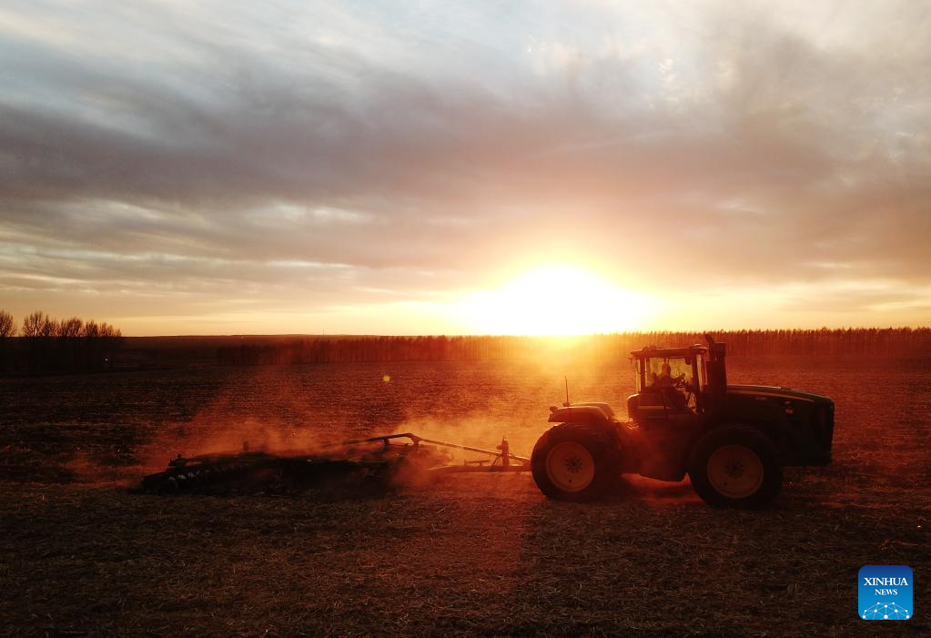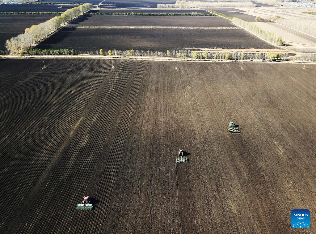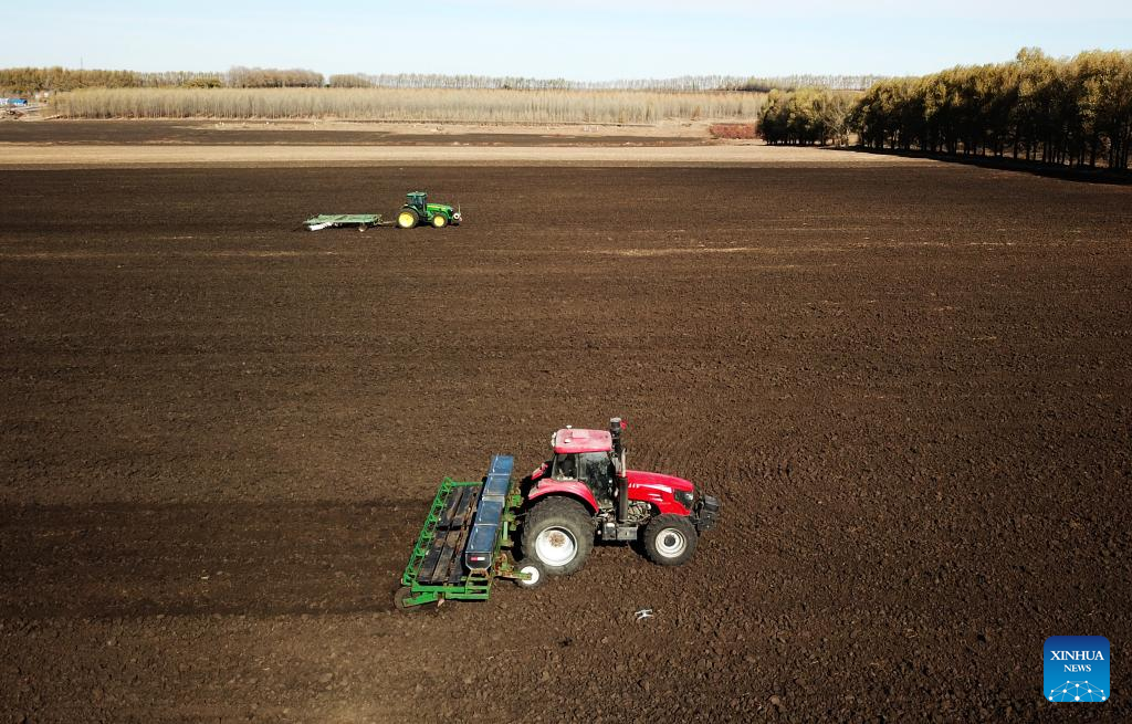 This aerial photo taken on Oct. 19, 2022 shows agricultural machines preparing the field for planting at the Zhaoguang Farm Co,. Ltd. under the Beidahuang Group Bei'an branch in northeast China's Heilongjiang Province. (Xinhua/Wang Jianwei)