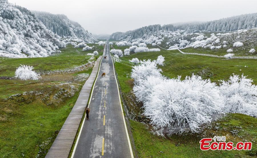 Trees are decorated with rime on Fairy Mountain in southwest China's Chongqing, turning the mountain range a winter wonderland. (Photo: China News Service/Wang Junjie)