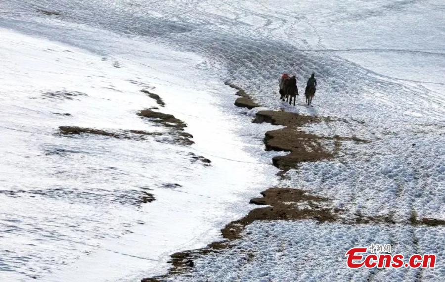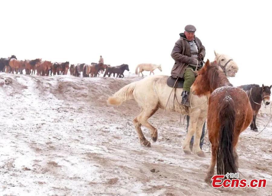 Herders drive livestock heading for a winter pasture in northwest China's Xinjiang Uyghur Autonomous Region. (Photo: China News Service/Yuan Junping)