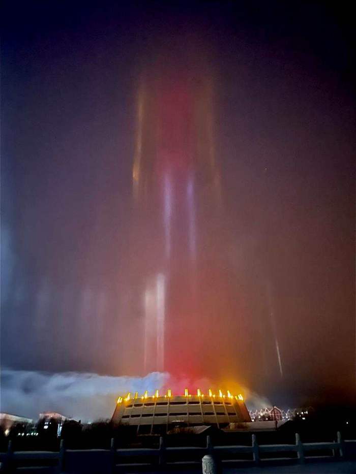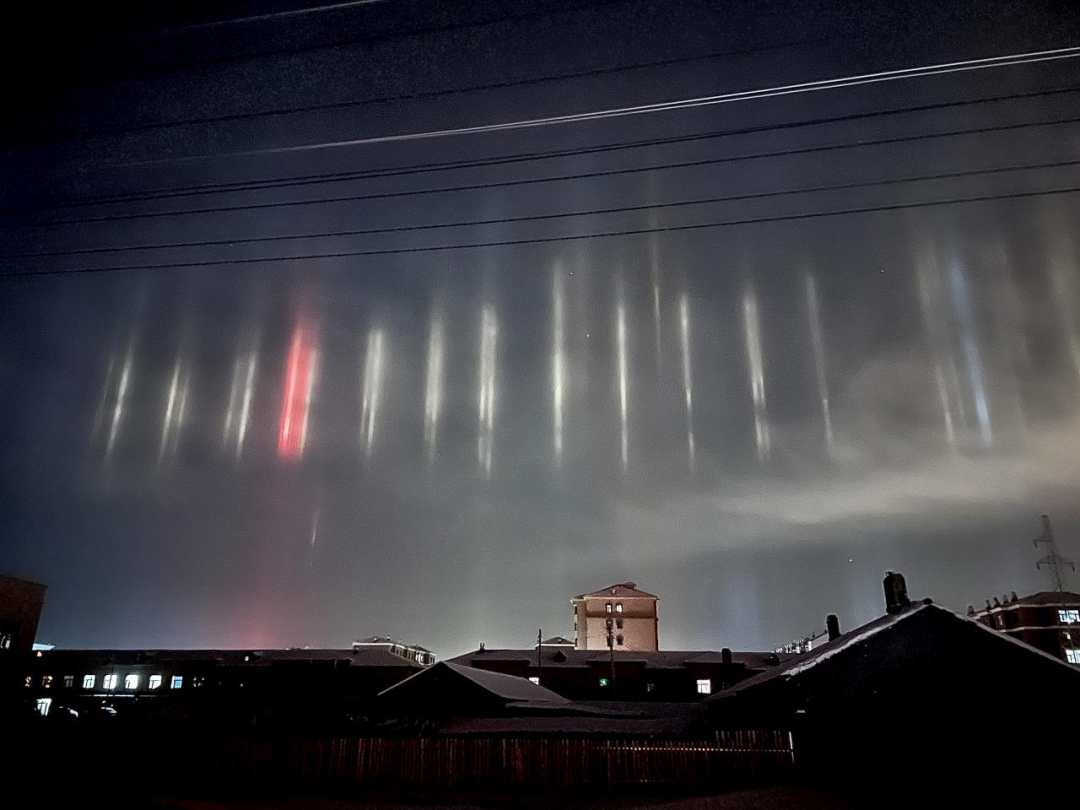 Natural light beams can sometimes be seen on winter nights in cold regions. The rare phenomenon occurs when light meets floating ice particles after snow. The lower the temperature is, the stronger the reflection of the light. On Nov. 27, the lowest temperature in Oroqen Autonomous Banner was about 30 degrees Celsius below zero.