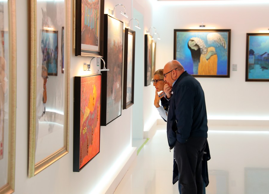 People look at paintings at an exhibition of art works in Riyadh, Saudi Arabia, on Dec. 8, 2022. Some 40 art works created by Arab artists who visited China have been exhibited in Riyadh to highlight the latest achievements of the China-Arab cultural exchanges and mutual learning. (Xinhua/Sui Xiankai)