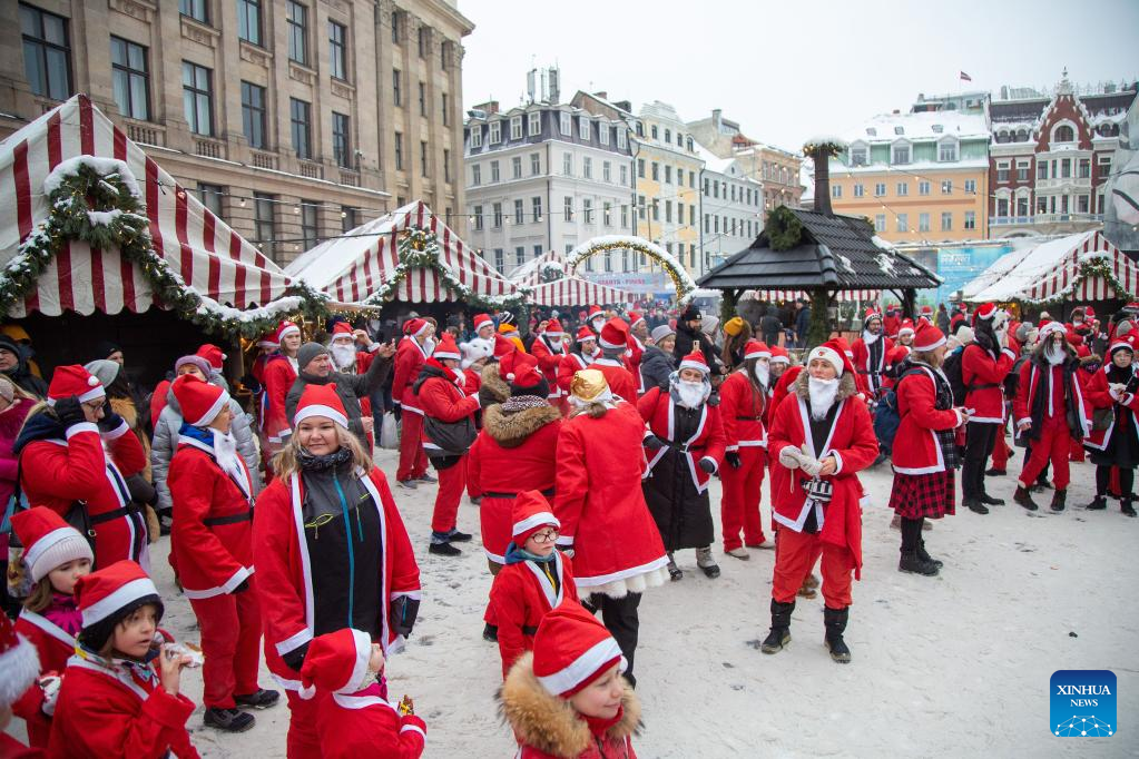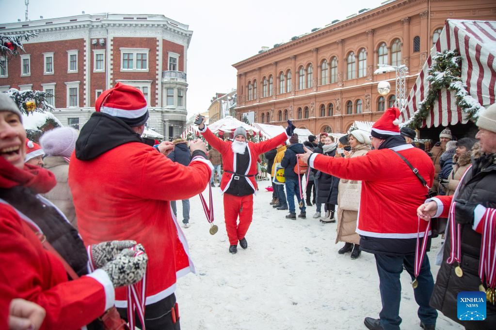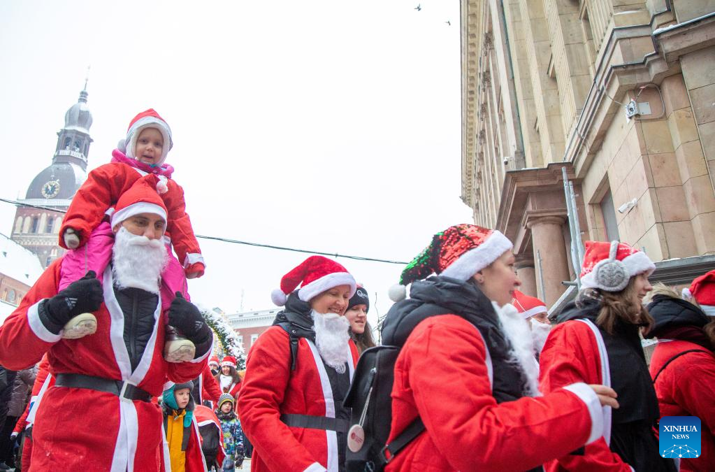 People dressed in Santa Claus costumes take part in a traditional Christmas Santa Claus charity run in Riga, Latvia, on Dec. 11, 2022. (Photo by Edijs Palens/Xinhua)
