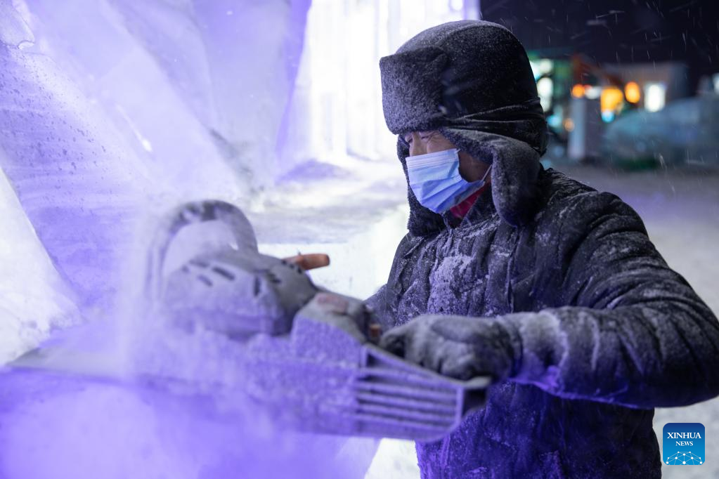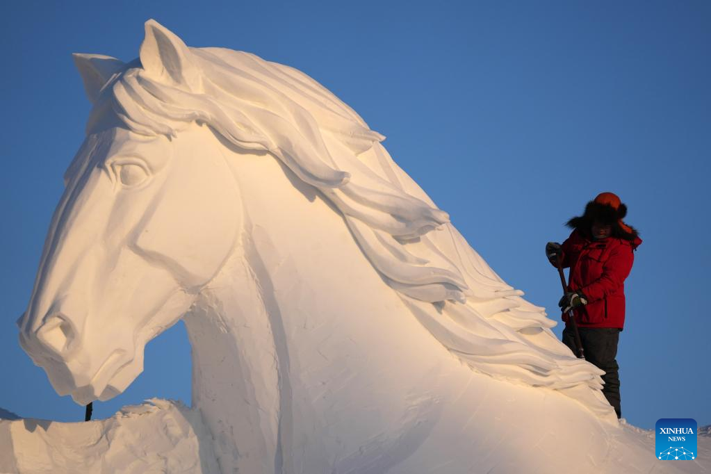A worker works at a snow sculpture at the venue of the Sun Island International Snow Sculpture Art Exposition in Harbin, northeast China's Heilongjiang Province, Dec. 11, 2022. (Xinhua/Wang Jianwei)