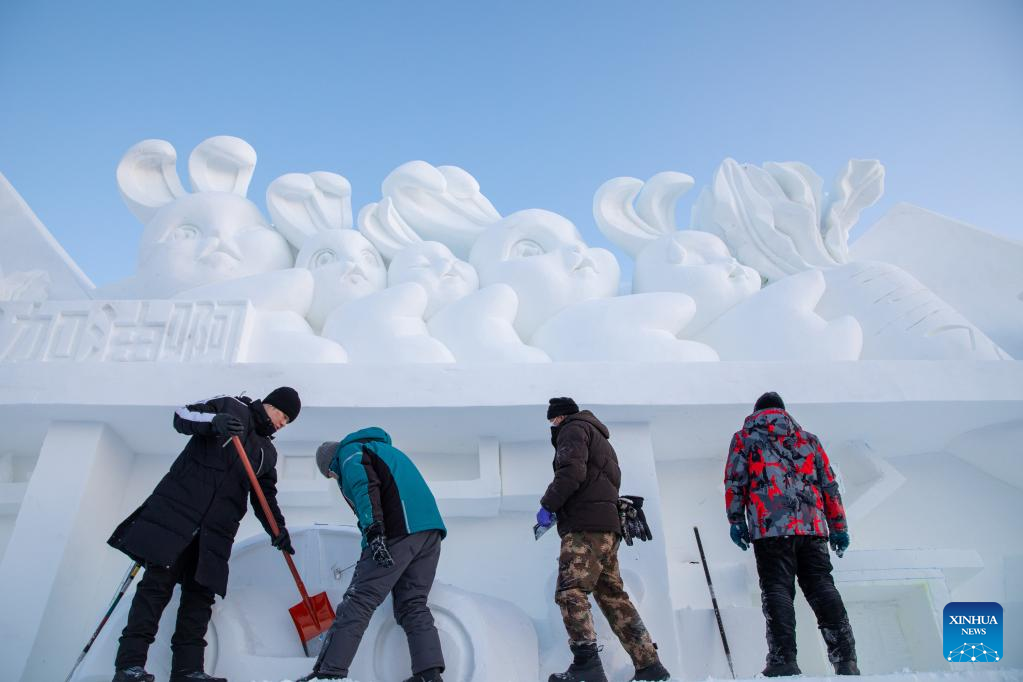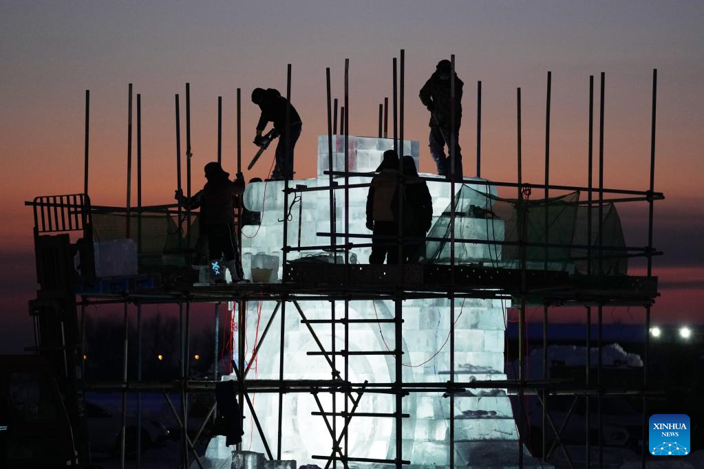 People prepare for Sun Island International Snow Sculpture Art Exposition in Harbin