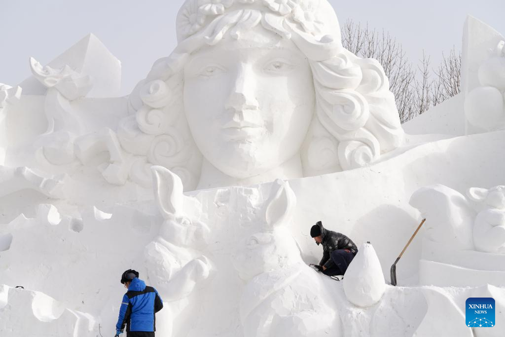 Workers work at a snow sculpture at the venue of the Sun Island International Snow Sculpture Art Exposition in Harbin, northeast China's Heilongjiang Province, Dec. 11, 2022. (Xinhua/Zhang Tao)