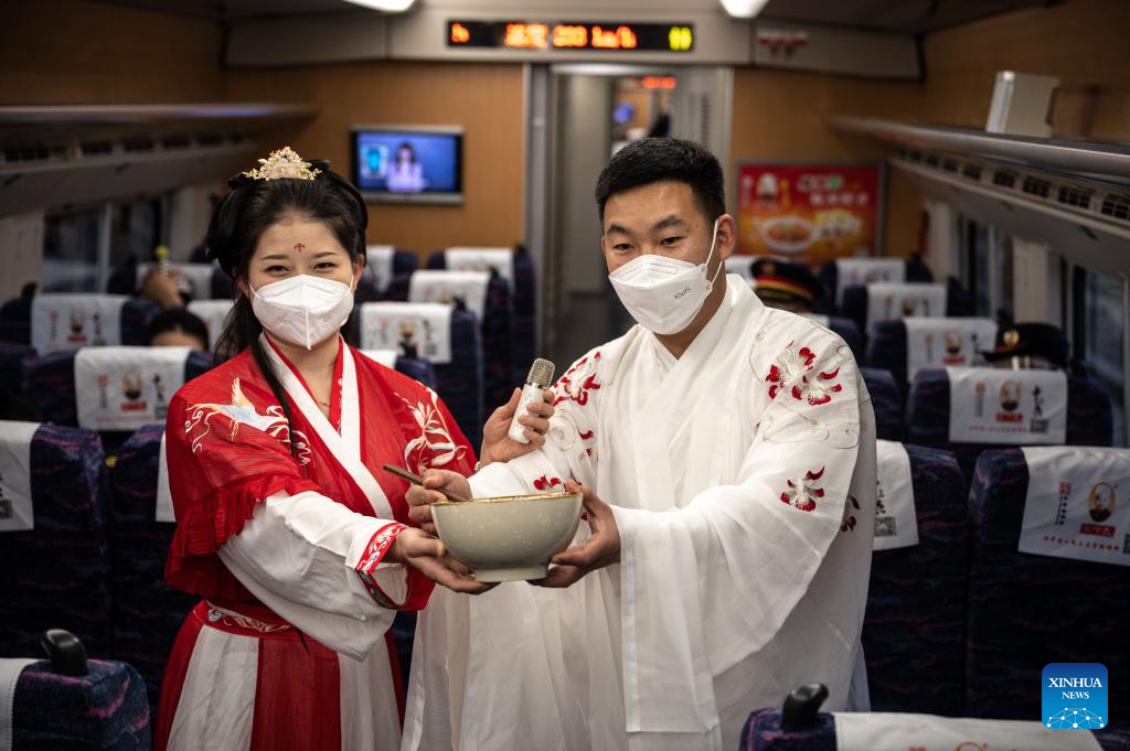 Conductors perform on a trial running train of Mile-Mengzi high-speed railway in southwest China's Yunnan Province, Dec. 14, 2022. (Xinhua/Wang Guansen)