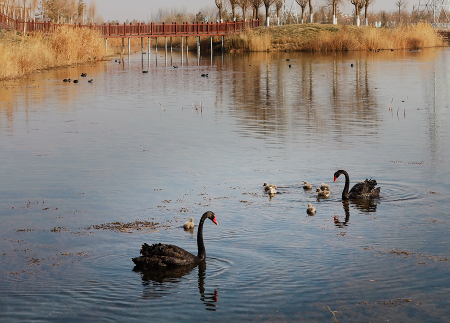 Photo shows a pair of black swans with their seven cygnets in Zhangye National Wetland Park, Zhangye city, northwest China’s Gansu Province. (Photo/Liu Fujun)