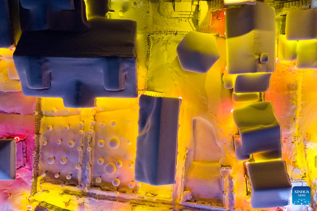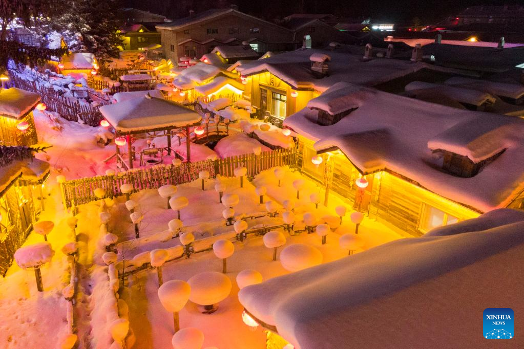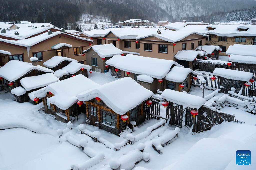 This aerial photo taken on Dec. 14, 2022 shows a view of the Snow Town scenic spot in Hailin City in northeast China's Heilongjiang Province. The Snow Town scenic spot officially opened recently. Enjoying a seven-month snow season, it has become an attraction for tourists for years. (Xinhua/Xie Jianfei)
