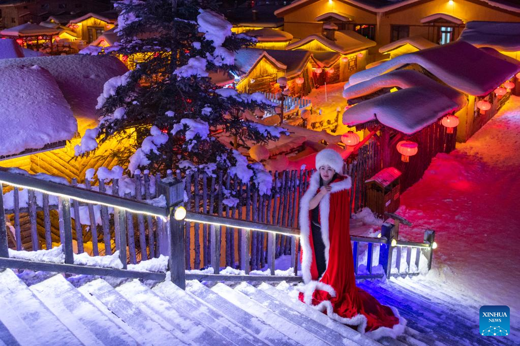 A tourist in rented costumes poses for photos at the Snow Town scenic spot in Hailin City in northeast China's Heilongjiang Province, Dec. 13, 2022. The Snow Town scenic spot officially opened recently. Enjoying a seven-month snow season, it has become an attraction for tourists for years. (Xinhua/Xie Jianfei)
