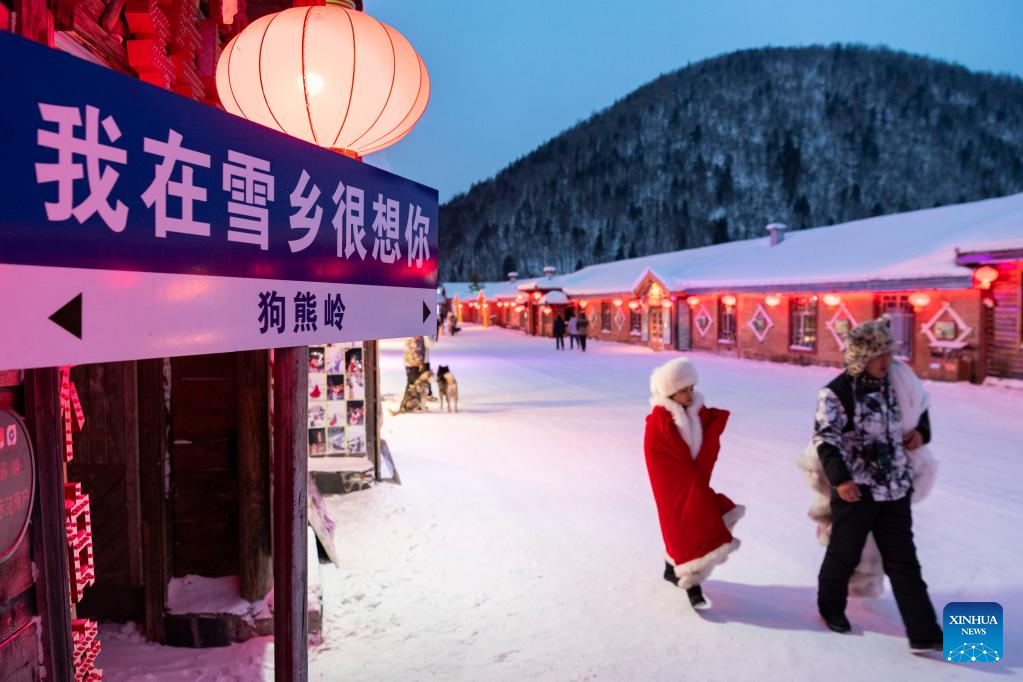 Visitors in rented costumes are seen at the Snow Town scenic spot in Hailin City in northeast China's Heilongjiang Province, Dec. 14, 2022. The Snow Town scenic spot officially opened recently. Enjoying a seven-month snow season, it has become an attraction for tourists for years. (Xinhua/Xie Jianfei)