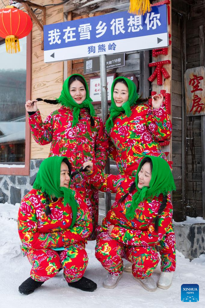 Tourists in rented costumes pose for photos at the Snow Town scenic spot in Hailin City in northeast China's Heilongjiang Province, Dec. 14, 2022. The Snow Town scenic spot officially opened recently. Enjoying a seven-month snow season, it has become an attraction for tourists for years. (Xinhua/Xie Jianfei)