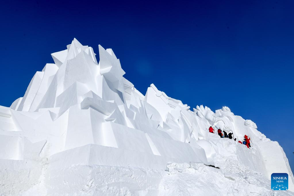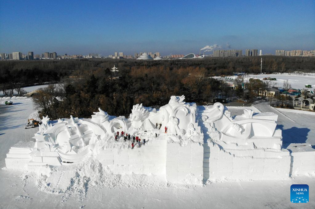 Staff members finish a gigantic snow sculpture for the upcoming 35th Taiyangdao Island International Snow Sculpture Expo in Harbin, northeast China's Heilongjiang Province, Dec. 18, 2022. (Xinhua/Wang Song)
