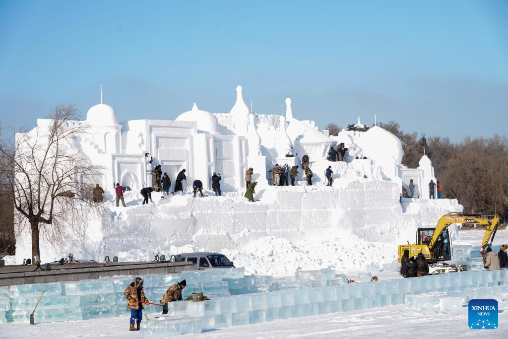 Preparations made for snow sculpture expo in Harbin, NE China