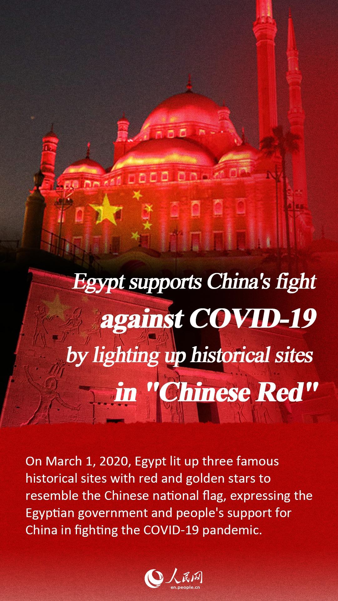 On March 1, 2020, Egypt lit up three famous historical sites with red and golden stars to resemble the Chinese national flag, expressing the Egyptian government and people's support for China in fighting the COVID-19 pandemic. The historical sites included the Saladin Citadel in Cairo, the Karnak Temple Complex in Luxor and the Philae Temple Complex in Aswan.