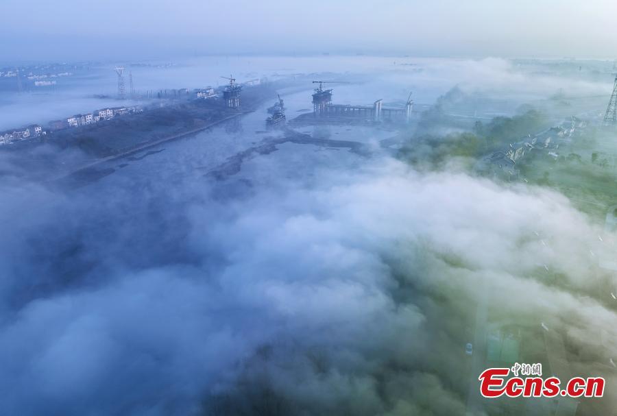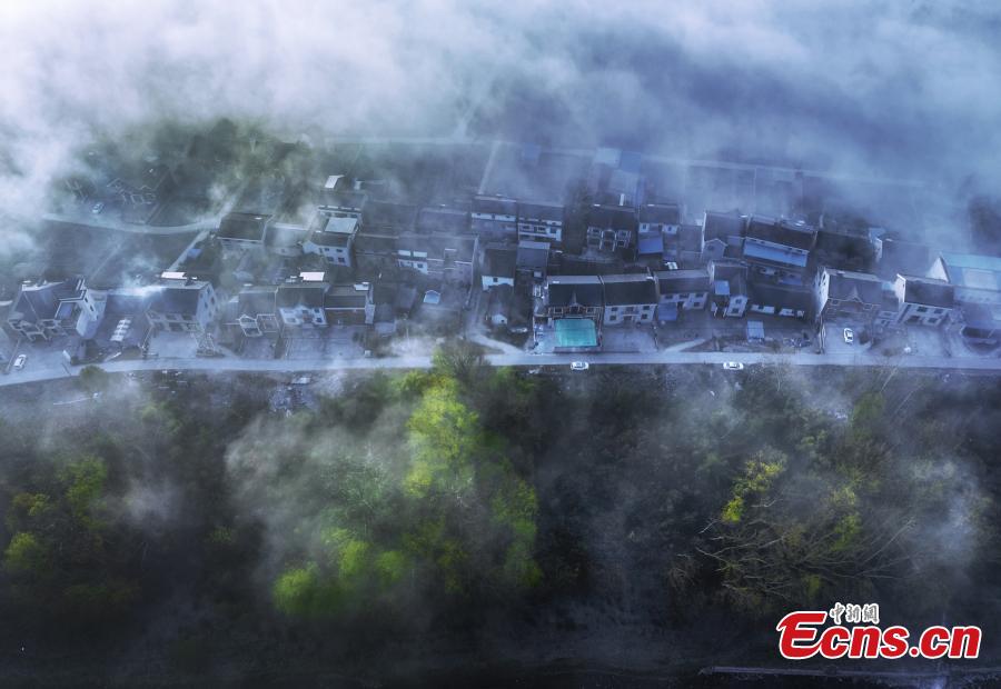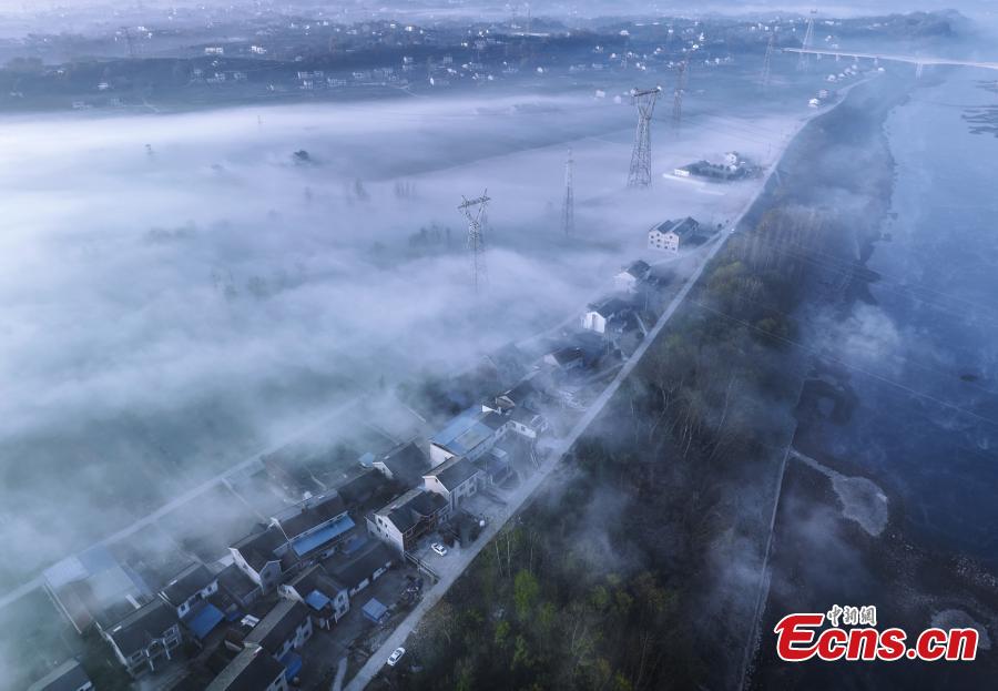 Advection fog shrouds Yidu, central China's Hubei Province, in the morning. The spectacle happens when the wind blows moist and warm air over a colder surface and cools down. (Photo: China News Service/Cao Lida)