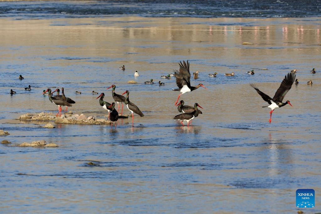 Black storks frolic at Mianman River in Jingxing County, north China's Hebei Province, Dec. 22, 2022. (Xinhua/Yang Shiyao)