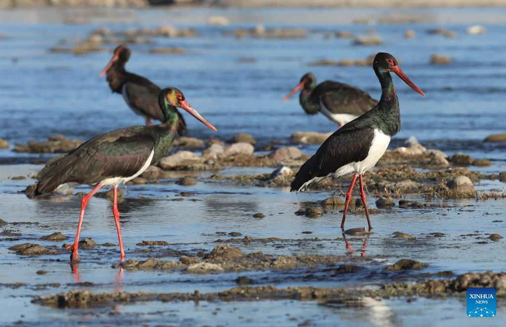 Black storks forage at Mianman River in Jingxing County, north China's Hebei Province, Dec. 22, 2022. (Xinhua/Yang Shiyao)