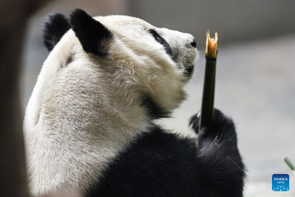 A giant panda eats bamboo at Xining Panda House in Xining, capital city of northwest China's Qinghai Province, Dec. 22, 2022. (Xinhua/Wu Gang)