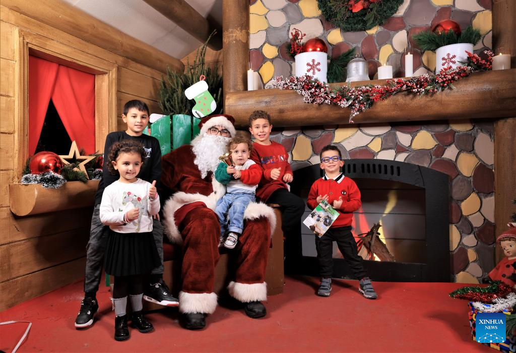 Children and a man dressed in Santa Claus costume pose for photos at a Christmas market in Beirut, Lebanon, on Dec. 18, 2022. (Xinhua/Liu Zongya)