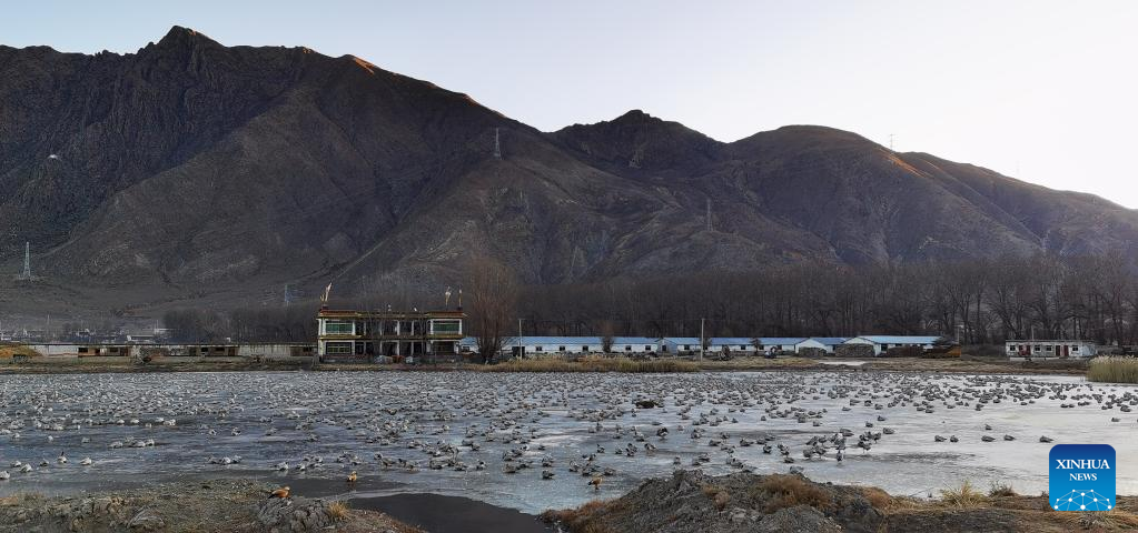 This photo taken by mobile phone on Dec. 24, 2022 shows migratory birds in Lhunzhub County of Lhasa, capital of southwest China's Tibet Autonomous Region. (Xinhua/Shen Hongbing)
