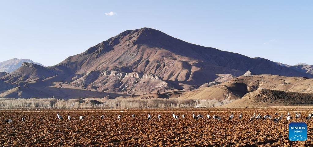 This photo taken by mobile phone on Dec. 24, 2022 shows a flock of black-necked cranes in Lhunzhub County of Lhasa, capital of southwest China's Tibet Autonomous Region. (Xinhua/Shen Hongbing)