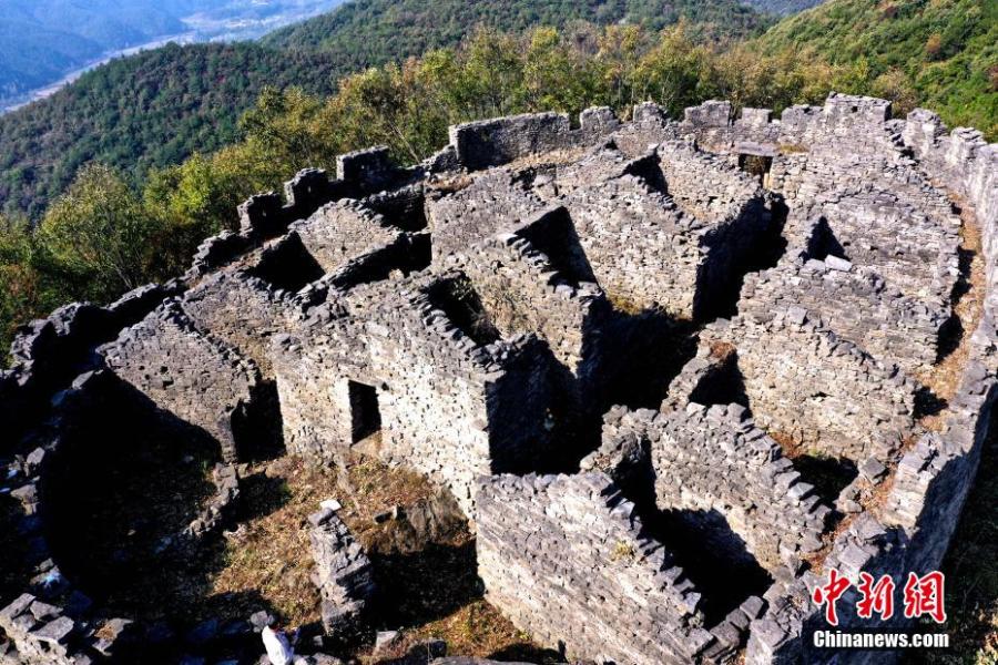 Aerial view shows remains of Maoya village, an ancient mountain village, at Nanzhang County of Xiangyang City, central China's Hubei Province, Dec. 23, 2022. (Photo: China News Service/Xiong Mingyin)